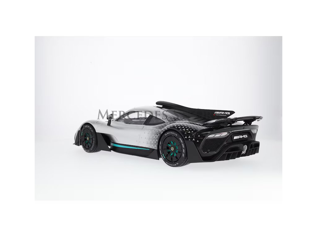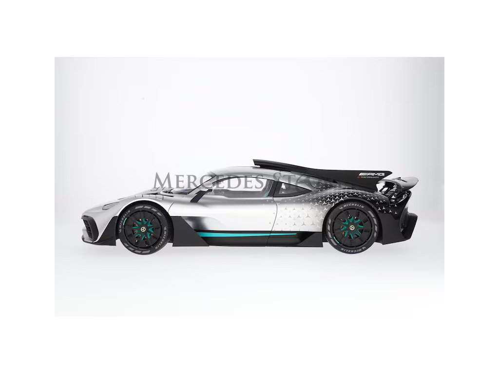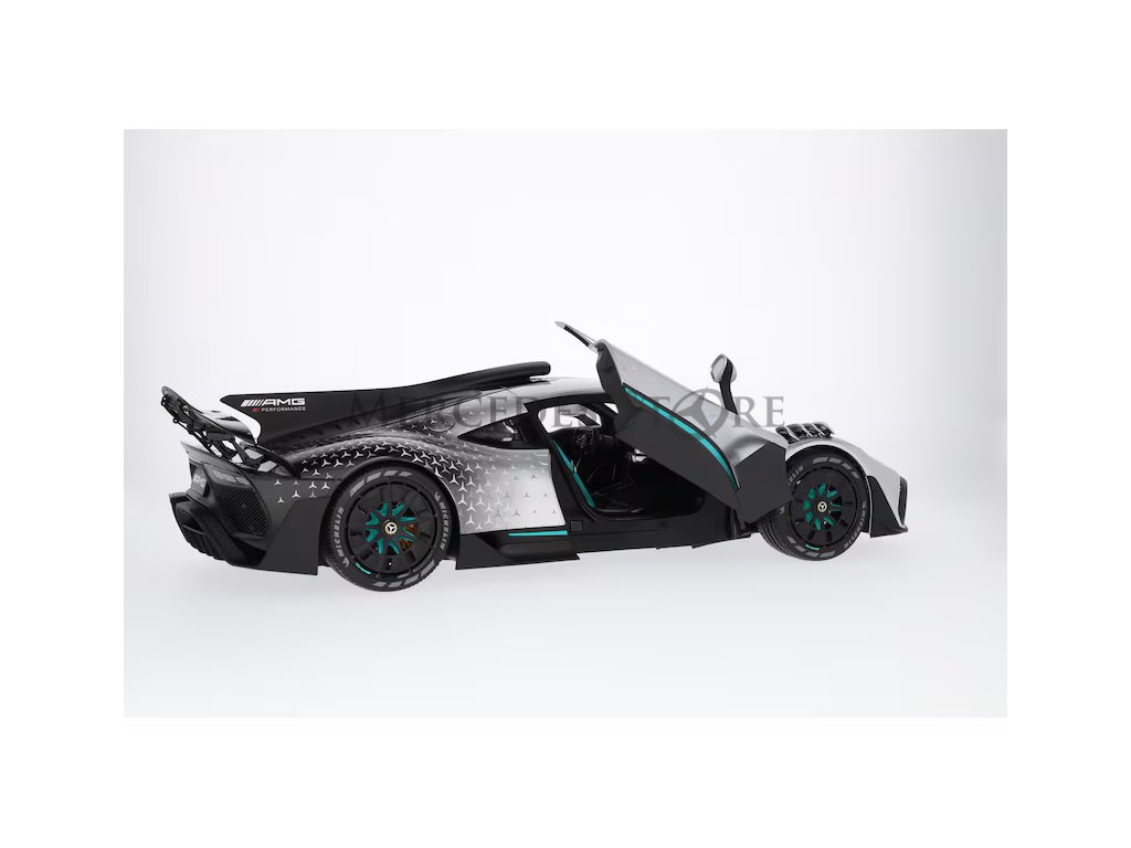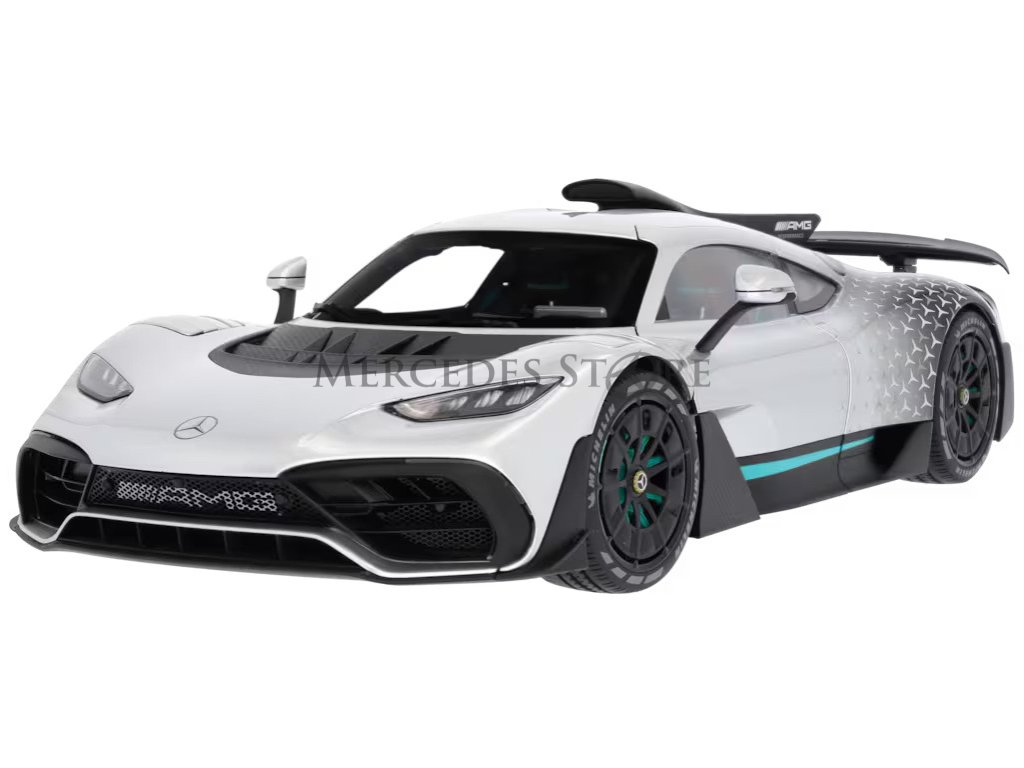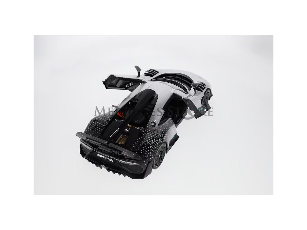 Sportovní jízda ve své nejčistší podobě – to je Mercedes-AMG ONE. Moderní závodní vůz s oprávněním pro silniční provoz je inspirován Formulí 1 a jistě zaujme svým neuvěřitelným výkonem. Ten zajišťuje v neposlední řadě plug-in hybrid E PERFORMANCE s turbobenzinovým motorem V6 1,6 l a čtyřmi elektromotory pro výfukové turbodmychadlo, klikovou hřídel a přední nápravu, které společně dodávají systémový výkon 1.063 PS koní. Nespoutaná síla a vynikající jízdní vlastnosti: s modelem vozu Mercedes-AMG ONE C298 se tato legenda nyní může stát součástí vaší domácí sbírky. Přesný model vytvořený s použitím originálních dat CAD pro maximální pozornost věnovanou detailům je dokončen v autentické barvě laku s přesně replikovanými detaily interiéru. Dveře řidiče a spolujezdce lze na modelu otevřít a umožnit tak pohled do interiéru vozidla. Kromě toho lze pohybovat různými částmi modelu vozu. Lze tak otevírat a zavírat smyčky na blatnících, sundávat panely motorového prostoru, vysouvat zadní spoiler, otevírat víčko palivové nádrže a víčko elektrického dobíjení a také pohybovat větracími víky na spodku vozidla. Model vozu je dodáván v obalu Mercedes-AMG, k němuž je přiložen šroubovák pro snadné vyjmutí a rukavice na ochranu před otisky prstů na zasklení a karoserii.