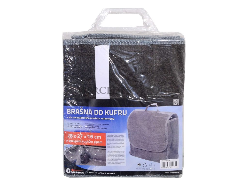 Univerzální textilní brašna, určená především do zavazadlového prostoru osobního automobilu. Uzavíratelná na suchý zip, snadno přenosná díky uchu na horní straně. Pásy suchého zipu na spodní i zadní straně pro snadné přichycení do zavazadlového prostoru automobilu. Velikost 18 x 14 x 32 cm.