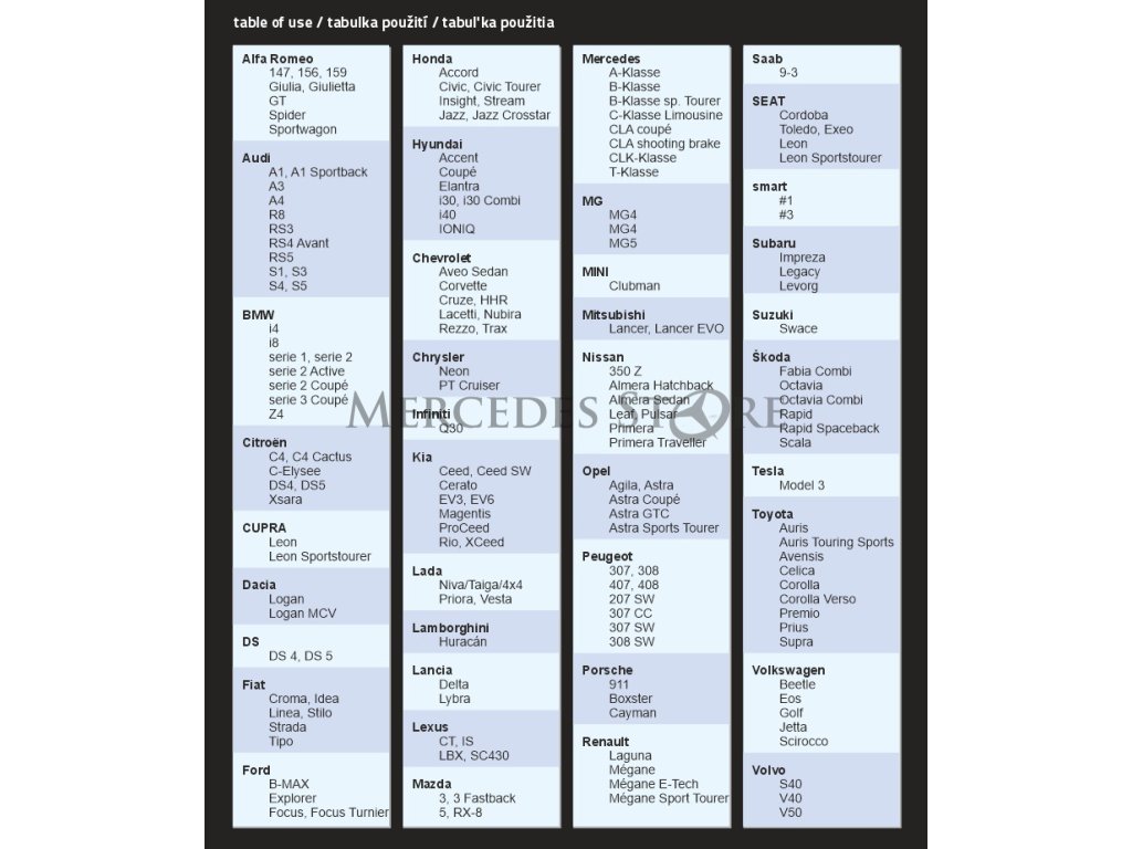 Mercedes | A-Klasse, B-Klasse, B-Klasse sports Tourer, C-Klasse Limousine, CLA coupé, CLA shooting brake, CLK-Klasse, T-Klasse |