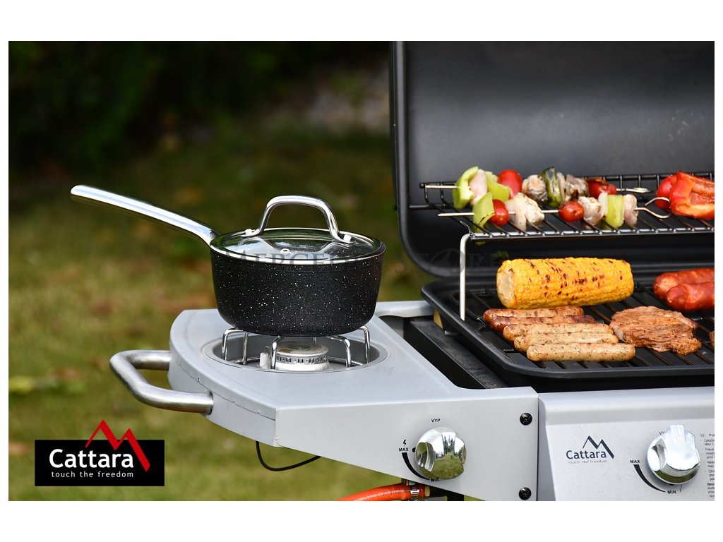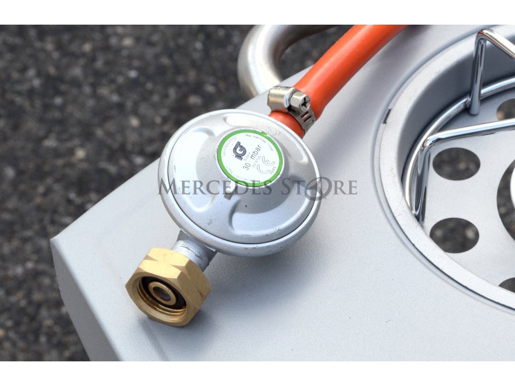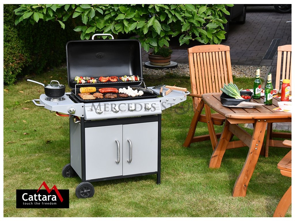 Gril je pojízdný (2 kolečka), je vybaven sklopným víkem s teploměrem a odkládacími poličkami s háky na příslušenství. Dále je vybaven přídavným bočním vařičem se samostatnou regulací a piezo zapalováním. Ve střední části je uzavíratelná skříňka s dvířky. Součástí je i spojovací hadice k plynové lahvi a redukční ventil. Díky sklopné boční poličce se gril snadno skladuje.