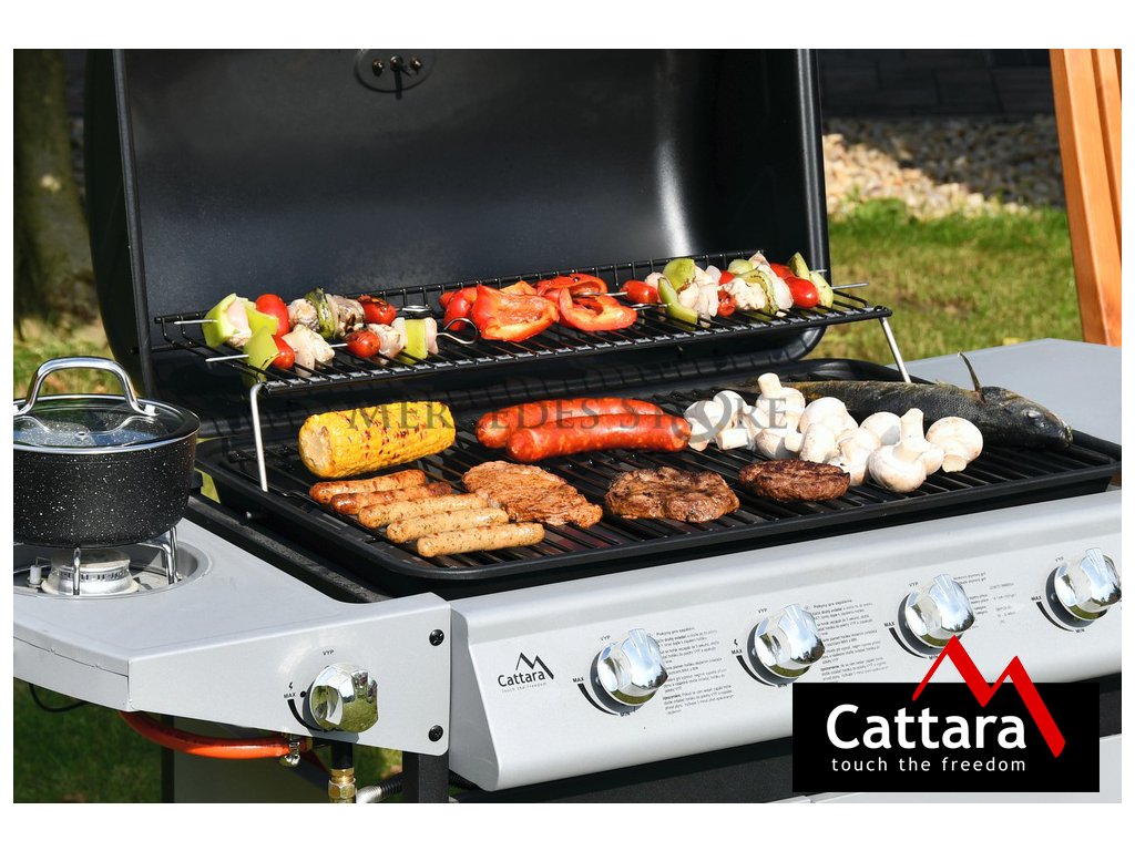 Plynový zahradní gril se systémem Flame Tamer. Hlavní grilovací prostor je osazen 4x hořákem se samostatnou regulací a piezo zapalováním a je vybaven roštem pro udržení teplých pokrmů. Díky možnosti vypnout prostřední hořáky je gril vhodný jak pro přímé, tak pro nepřímé grilování.