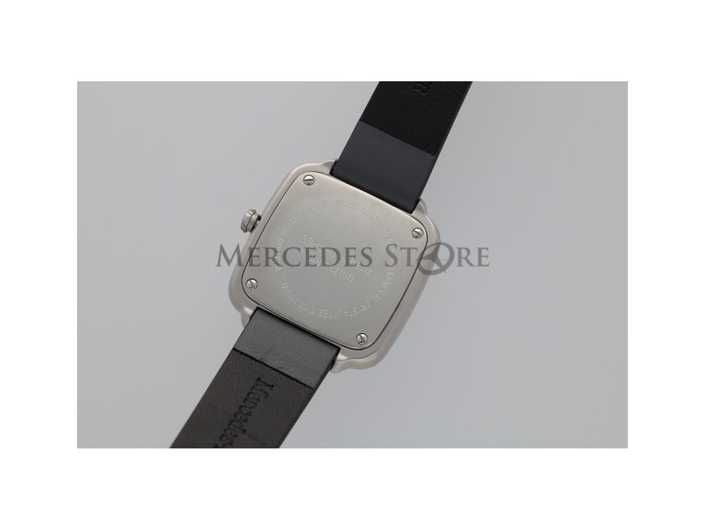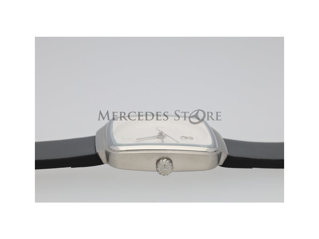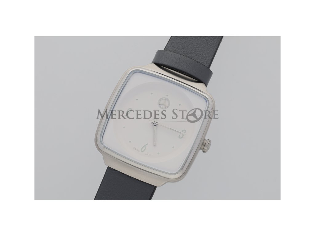 Perfect for today's fashionable woman: the women's wristwatch in a modern design adds highlights to every wrist and at the same time impresses with its functionality. For the wearer doesn't lose sight of the time. The watch sports a square case in stainless steel and has a white dial, which features an eye-catching hollow in the centre. In this lower zone there are embossed digits and markers which feature a silver colour for better readability. And even in darkness the time can be seen, as the silver-coloured markers feature Super-LumiNova® luminous material. The look of the modern watch is completed by a raised Mercedes star positioned at 12 o'clock. The watch, which is fitted with a Ronda 1063 quartz movement displaying the hour, minute and second, is water-resistant up to 5 ATM and is comfortable to wear with its anthracite-coloured calfskin leather strap with a pin buckle.