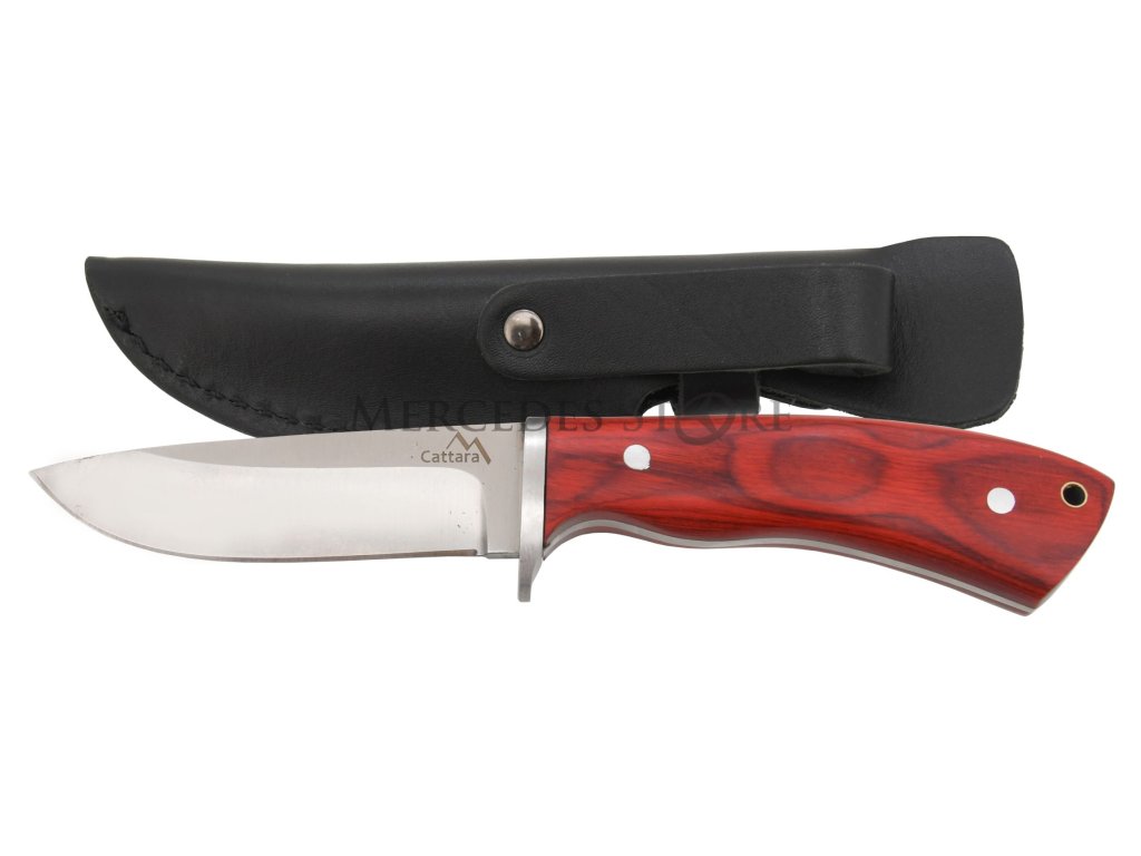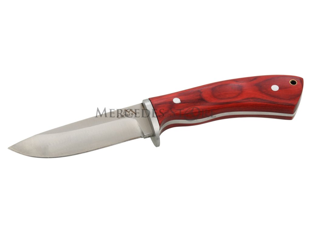 Rukojeť je osazena precizně opracovanými střenkami z vyřezávaného Pakkawood červené barvy, nůž perfektně padne do ruky a je opatřen zarážkou chránící nositele před pořezáním.