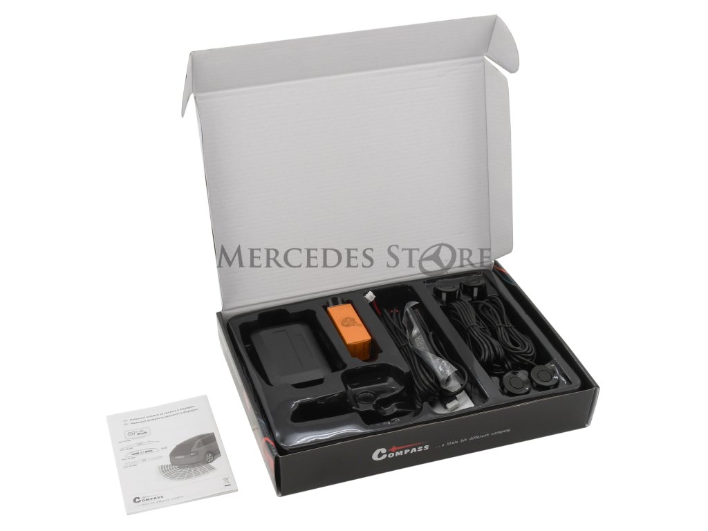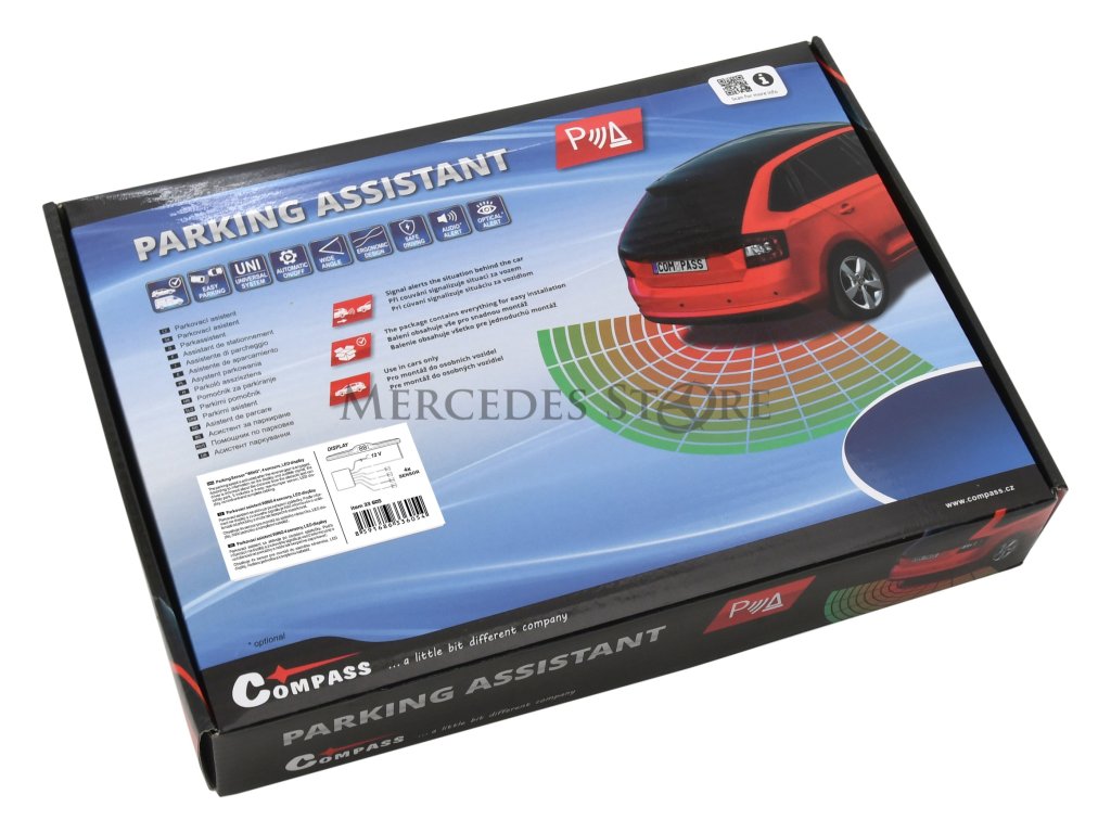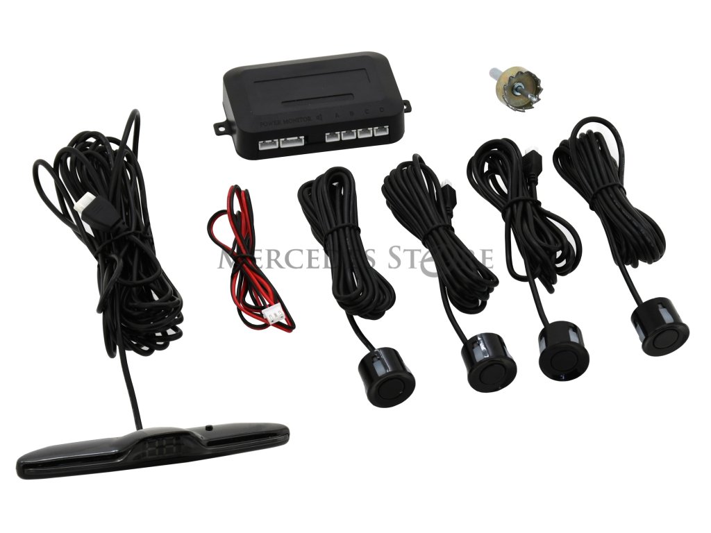 Balení obsahuje displej, řídící jednotku, 4 senzory pro montáž do zadního nárazníku, odpovídající kabeláž a vrták odpovídajícího průměru.