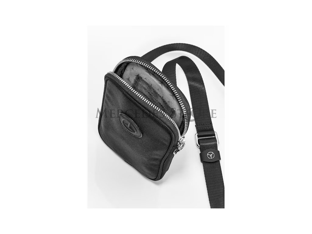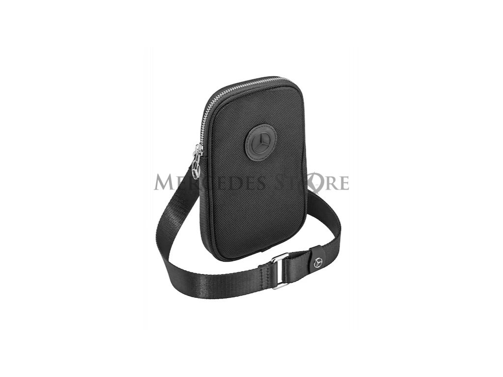 Taška na mobilní telefon z recyklovaného polyamidu je všestranný společník, který umožňuje uložit mobilní telefon nebo smartphone. Vnitřní rozměry hlavní přihrádky jsou cca 17 cm x 10 cm x 1,8 cm. Je také vybavena 3 přihrádkami na kreditní karty a malou čtvercovou zasouvací kapsou na sledovací štítek do maximální velikosti 40 x 40 mm. Pohodlné nošení zajišťuje odnímatelný ramenní popruh, jehož délku lze individuálně nastavit. Zipy stříbrné barvy s 3D hvězdičkovými přívěsky perfektně kontrastují s černou nylonovou tkaninou. Zvláštním detailem je výrazná značka, která dodává tašce přes rameno exkluzivní nádech. Odznak s logem i další kožené aplikace na tašce přes rameno jsou vyrobeny ze stejné kůže, která se používá na sedadla a vybavení v elegantním interiéru vozu Mercedes-Benz třídy S.