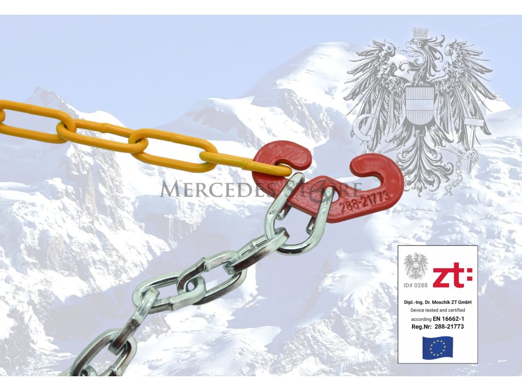 Sněhové řetězy se zesílenými oky, pro osobní vozidla do hmotnosti 2200 kg, splňující evropské normy včetně v Rakousku vyžadované "ÖNORM V 5117".