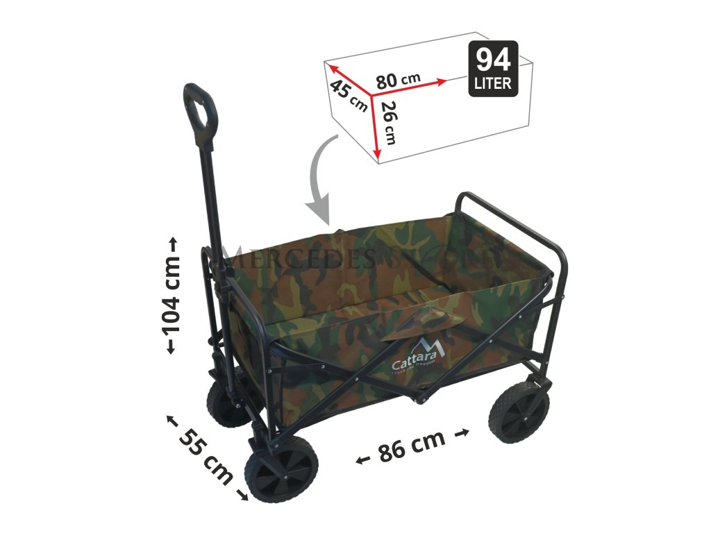Celkové rozměry vozíku 94 x 77 x 54 cm a ve složeném stavu 54 x 77 x 19 cm, s váhou 8 kg. Nákladový prostor je objemný a díky své konstrukci je možné naložit mnohem více věcí, až do povolené nosnosti. Čelní strana korby vozíku je opatřena dvěma sítěnými kapsami na lahve s pitím, či opalovací krémy apod.